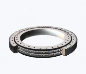雙排球式回轉(zhuǎn)支承具有三個(gè)座圈,鋼 球和隔離塊可直接排入上下滾道,根據(jù)受力狀況,安排了上下兩排直徑不同的鋼球。這種開(kāi)式裝配非常方便,上下圓弧滾道的承載角都為90°,能承受很大的軸向 力和傾翻力矩。當(dāng)徑向力大于0.1倍的軸向力時(shí)滾道須特殊設(shè)計(jì)。雙排球式回轉(zhuǎn)支承的軸向、徑向尺寸都比較大,結(jié)構(gòu)緊固。特別適用于要求中等以上直徑的塔式 起重機(jī),汽車(chē)起重機(jī)等裝卸機(jī)械上。